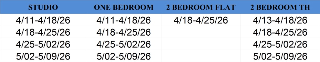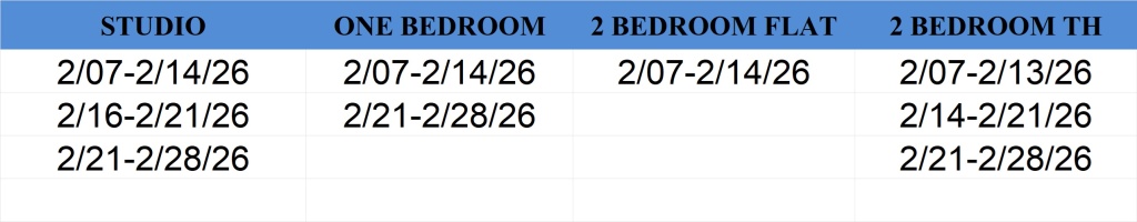 RATES (for Owners and Owner’s guests only): Studio $95/nt, 1 Bedroom $125/nt, 2 Bedroom $160/nt. Effective 1/1/26